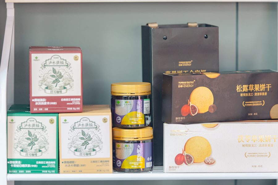 此外,展销中心通过推出咖啡豆、挂耳咖啡、浓缩咖啡液等衍生产品,进一步提升产品附加值,并专门设立怒江农特产品展区,带动农户可持续增收,助力乡村振兴与共同富裕。