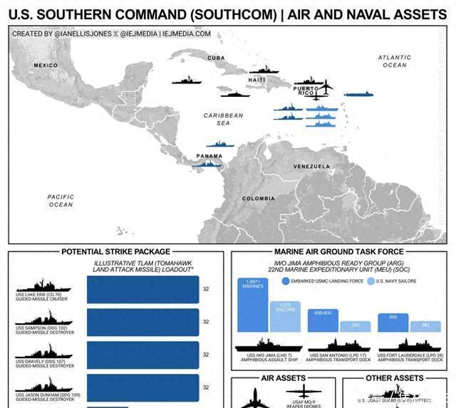 负责这次作战任务的是美军南方司令部,该司令部表示:9月2日美军发现了这艘“从委内瑞拉出发的贩毒船只”后,立即对这艘船只发动了攻击,将船上的11名“毒贩”全部打死!目前美军硫磺岛号两栖攻击舰、劳德代尔堡号船坞登陆舰以及圣安东尼奥号船坞登陆舰这三艘大舰,搭载数千名美国海军陆战队士兵已经部署在加勒比海,此外还有多艘美国海军的宙斯盾战舰负责护航,美军称出动这一舰队是为了“打击委内瑞拉的贩毒活动”。