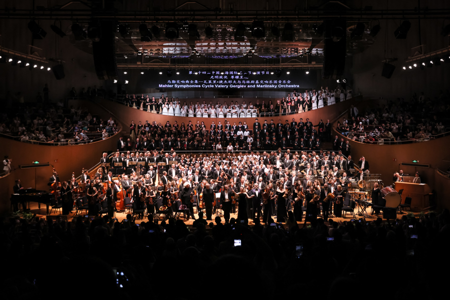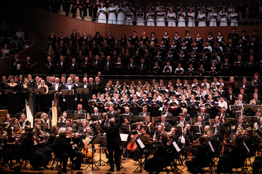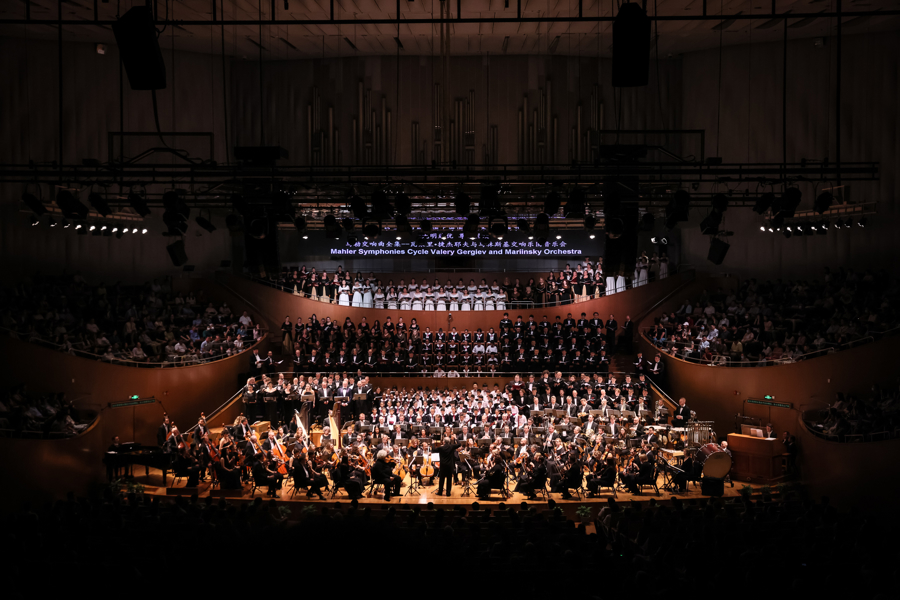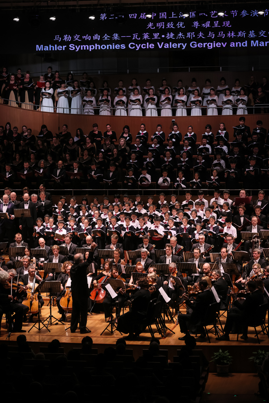 当记者近日走进上海东方艺术中心音乐厅,马勒《第八交响曲》(以下简称“马八”)的磅礴气场扑面而来——上海歌剧院合唱团90余位成员、马林斯基剧院合唱团成员与上海爱乐少儿合唱团近百名孩子依次列队,童声方阵静立在马林斯基交响乐团后方,孩子们捏着谱角的指尖透着专注。