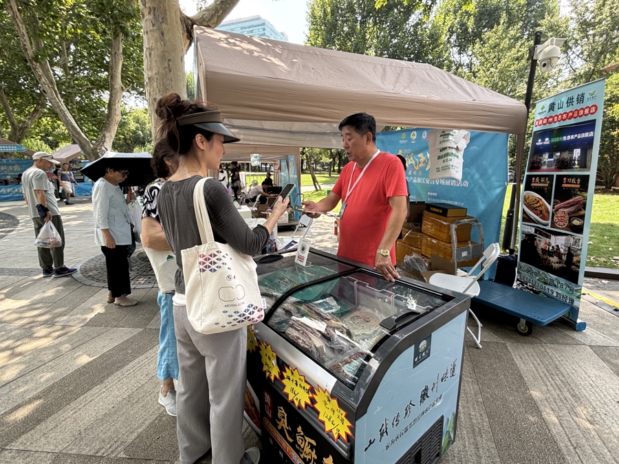 除了安吉好物,长三角各地的特色农产品也不少。“散养老母鸡已经卖完了,明天我们会补货的。”在安徽省黄山市供销合作社的展位上,不时有市民冲着臭鳜鱼而来,又看到了老母鸡、刀板香、扁尖等美味。展台负责人说,这些老母鸡都是散养的,白天在山里遛达,晚上上树睡觉,至少要养足11个月才能上市,最适合炖汤。
