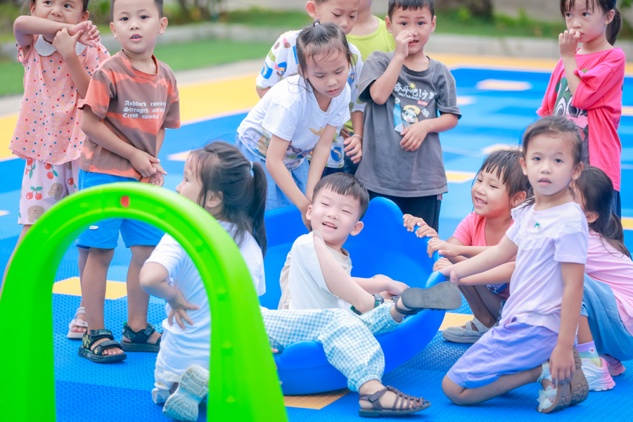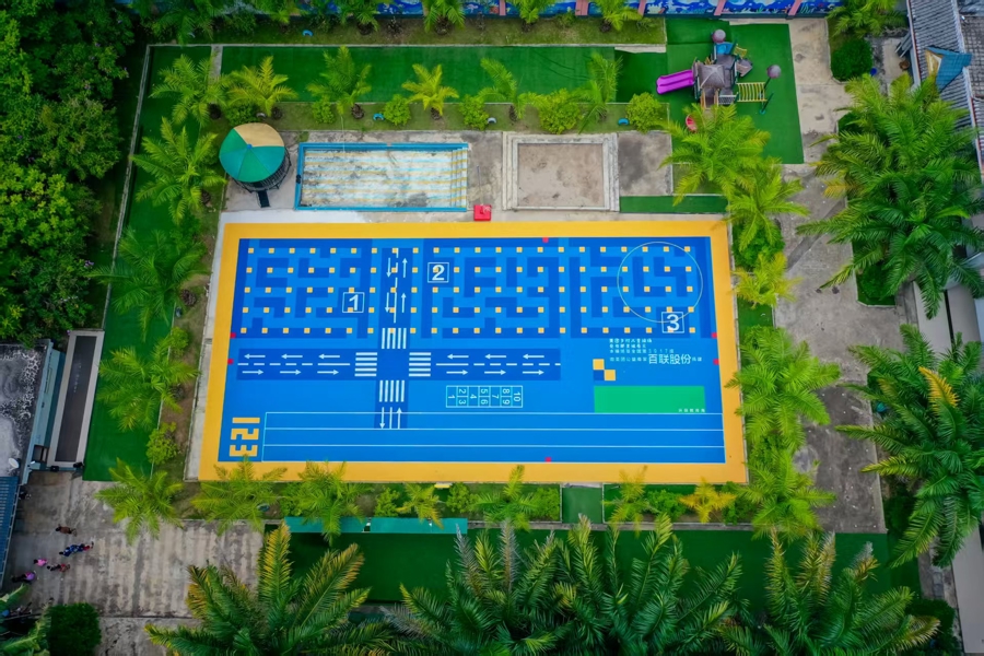 落成后的多功能操场不仅配备了适合幼儿的篮球架、小推车等器材,还划分出包括跑道区域、交通安全教育区及环保教育角在内的8个功能区,兼顾体育锻炼与生活教育。